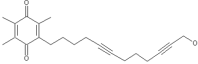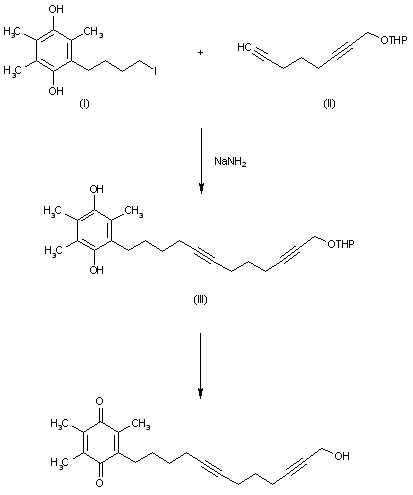The condensation of 2,5,6-trimethyl-3-(4-iodobutyl)hydroquinone (I) with octa-2,7-diyn-1-ol tetrahydropyranyl ether (II) by means of sodium amide in liquid ammonia gives 2,5,6-trimethyl-3-[12-(tetrahydropyranyloxy)-5,10-dodecadiynyl]hydroquinone (III), which is oxidized with ceric ammonium nitrate in aqueous acetonitrile and deprotected in the usual way.
