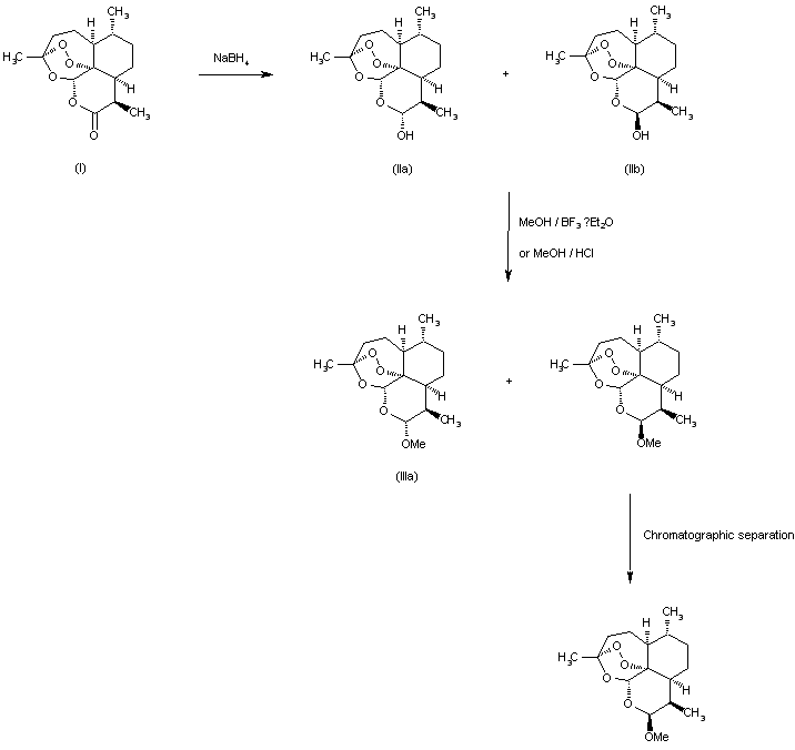 Reduction of qinghaosu (artemisine) (I) by means of sodium borohydride gives a hemiacetal, artemisininelactol (II). Interaction of the latter compound with methanol in the presence of boron triftuoride gives artemether. It can be prepared even more easily by treating artemisininelactol with methanol in acidic medium. The epimers can be separated by chromatography. However, the product without separation of epimers has been used for clinical studies.