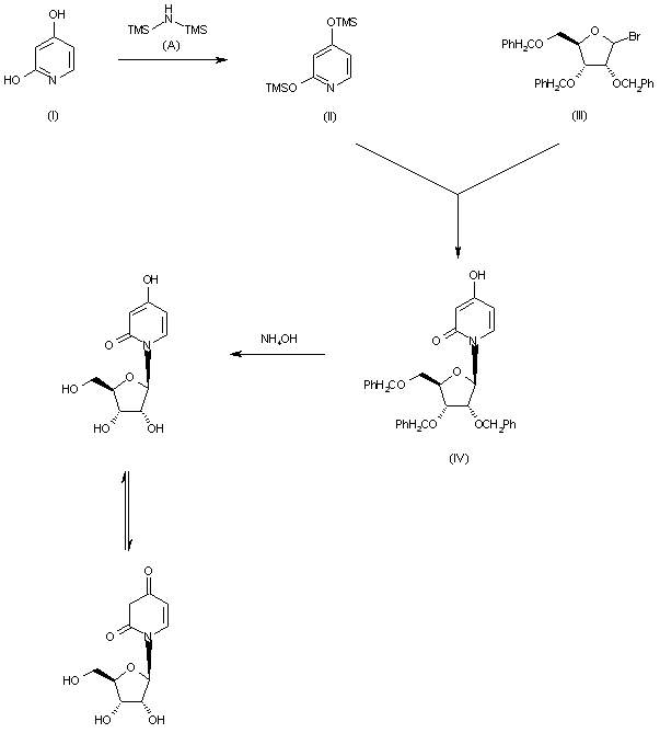 Treatment of 2,4-dihydroxypyridine (I) with hexamethyldisilazane (A) gives 2,4-bis(trimethylsilyloxy)pyridine (II). Condensation of (II) with 2,3,5-tri-O-benzoyl-D-ribofuranosyl bromide (III) gives a 68% yield 2',3',5'-tri-O-benzoyl-3-deazauridine (IV). Deblocking of (IV) with alcoholic ammonia gives 3-deazauridine in 88% crude yield.
