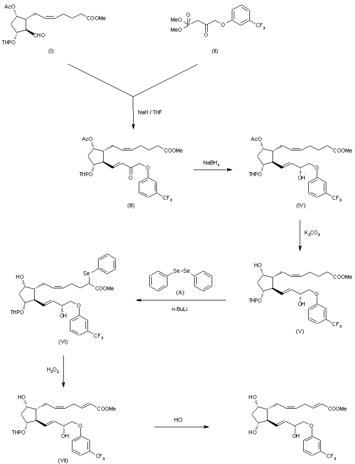 The Wittig reaction of 1alpha-acetoxy-2alpha-(6-methoxycarbonyl-hex-2-cis-enyl)-3beta-formyl-4alpha-(2-tetrahydropyranyloxy)cyclopentane (I) and dimethyl 2-oxo-3-(3-trifluoromethylphenoxy)propylphosphonate (II) by means of NaH in hot THF gives 9alpha-acetoxy-11alpha-(2-tetrahydropyranyloxy)-15-oxo-16-(3-trifluoromethylphenoxy)-17,18,19,20-tetranorprosta-5-cis-13-trans-dienoate (III), which is reduced with NaBH4 in methanol yielding the protected trihydroxy compound (IV). The partial hydrolysis of (IV) with K2CO3 in methanol affords the dihydroxytetrahydropyranyloxy compound (V), which by reaction with diphenyldiselenide (A) by means of 17-butyllithium and diisopropylamine in THF is converted into the mixed selenide (VI). The treatment of (VI) with H2O2 in THF-ethyl acetate gives methyl 9alpha,15alpha-dihydroxy-11alpha-(2-tetra)-17,18,19,20-tetranorprosta-2-trans-5-cis-13-trans-trienoate (VII), which is finally treated with HCl in THF-water to eliminate the tetrahydropyranyl group.