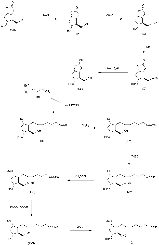 The hydrolysis of 2-oxa-3-oxo-6-syn-hydroxymethyl-7-anti-acetoxy-cis-bicyclo[3.3.0]octane (VIII) (2) with KOH in methanol gives the dihydroxy compound (IX), which is acetylated with acetic anhydride in pyridine to give the acetoxymethyl compound (X). The treatment of (X) with dihydropyran and p-toluenesulfonic acid in methylene chloride affords the tetrahydropyranyl derivative (XI), which is reduced with diisobutylaluminum hydride in toluene to yield 2-oxa-3-hydroxy-6-syn-hydroxymethyl-7-anti-(2-tetrahydropyranyloxy)-cis-bicyclo[3.3.0]octane (XII). The Wittig reaction of (XII) with 4-carboxybutyltriphenylphosphonium bromide (B) by means of NaH in DMSO gives 2alpha-(6-carboxyhex-2-cis-enyl)-3beta-hydroxymethyl-4alpha-(2-tetrahydropyranyloxy)cyclopentan-1alpha-ol (XIII), which is esterified with CH2N2 to the corresponding methyl ester (XIV). The reaction of (XIV) with trimethylchlorosilane in pyridine - methylene chloride gives the monotrimethylsilyl derivative (XV), which is acetylated with acetyl chloride affording the fully protected compound (XVI). The partial hydrolysis of (XVI) with oxalic acid in water-ethyl acetate yields the compound (XVII) with a free hydroxymethyl group, which is finally oxidized with CrO3 in methylene chloride pyridine to give the starting 1alpha-acetoxy-2alpha-(6-methoxycarbonylhex-2-cis-enyl)-3beta-formyl-4alpha-(2-tetrahydropyranyloxy)cyclopentane (I).