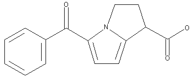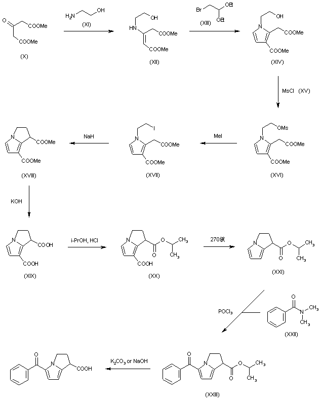 The condensation of dimethylacetone-1,3-dicarboxylate (X) with ethanolamine (XI) yields methyl 3-(methoxycarbonylmethyl)-3-(2-hydroxyethylamino)acrylate (XII), which is cyclized with bromoacetaldehyde diethylacetal (XIII) affording methyl 1-(2-hydroxyethyl)-3-methoxycarbonylpyrrol-2-acetate (XIV). Acylation of (XIV) with methanesulfonyl chloride (XV) and triethylamine in CH2Cl2 yields the corresponding mesylate (XVI), which by treatment with methyl iodide in refluxing acetonitrile is converted into methyl 1-(2-iodoethyl)-3-methoxycarbonylpyrrole-2-acetate (XVII). The cyclization of (XVII) with NaH in DMF yields dimethyl 1,2-dihydro-3H-pyrrolo[1,2-a]pyrrole-1,7-dicarboxylate (XVIII), which is hydrolyzed with KOH in refluxing methanol - water to the corresponding diacid (XIX). Partial esterification of (XIX) with isopropanol and HCl gives isopropyl 1,2-dihydro-3H-7-carboxypyrrolo[1,2-a]pyrrole-1-carboxylate (XX), which is decarboxylated by heating at 270 C affording isopropyl 1,2-dihydro-3H-pyrrolo[1,2-a]pyrrole-1-carboxylate (XXI). Benzoylation of (XXI) with N,N-dimethylbenzamide (XXII) and POCl3 in refluxing CH2Cl2 yields isopropyl 5-benzoyl-1,2-dihydro-3H-pyrrolo[1,2-a]pyrrole-1-carboxylate (XXIII), which is finally hydrolyzed with K2CO3 or NaOH in methanol - water.