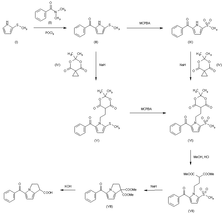 The benzoylation of 2-methylthiopyrrole (I) with N,N-dimethylbenzamide (II) by means of POCl3 in refluxing CH2Cl2 gives 5-benzoyl-2-methylthiopyrrole (III), which is condensed with spiro[2.5]-5,7-dioxa-6,6-dimethyloctane-4,8-dione (IV) by means of NaH in DMF yielding compound (V). The oxidation of (V) with m-chloroperbenzoic acid in CH2Cl2 affords the sulfone (VI), which is submitted to methanolysis with methanol and HCl giving 1-(3,3-dimethoxycarbonylpropyl)-2-methanesulfonyl-5-benzoylpyrrole (VII). The cyclization of (VII) with NaH in DMF yields dimethyl 5-benzoyl-1,2-dihydro-3H-pyrrolo[1,2-a]pyrrole-1,1-dicarboxylate (VIII), which is finally hydrolyzed and decarboxylated with KOH in refluxing methanol. Compound (III) can be oxidized with m-chloroperbenzoic acid as before giving 2-methanesulfonyl-5-benzoylpyrrole (IX), which is then condensed with spiro compound (IV) as before to afford compound (VI), already obtained.