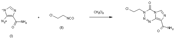 By cyclization of 5-diazoimidazole-4-carboxamide (I) with 2-chloroethyl isocyanate (II) in dichloromethane.