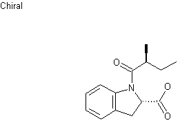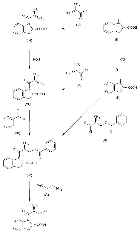 This compound can be obtained by several related ways: 1) The hydrolysis of ethyl indoline 2 carboxylate (I) with KOH in aqueous DMSO gives indoline 2-carboxylic acid (II), which is acylated with 3-(benzoylthio)-2-methylpropanoyl chloride (III) in methylene chloride yielding 1-[3-(benzoylthio)-2-methyl-1-oxopropyl]indoline-2-carboxylic acid (IV). Finally, this compound is debenzoylated by treatment with 2-methoxyethylamine (A). 2) The acylation of (I) with methacryloyl chloride (V) by means of triethylamine in ether yields ethyl 1-methacryloylindoline-2-carboxylate (VI), which is hydrolyzed with KOH in aqueous DMSO affording 1-methacryloylindoline-2-carboxylic acid (VII). Finally, this compound is treated with thiobenzoic acid (VIII) and 4-dimethylaminopyridine in acetone to give (IV), previously synthesized. 3) The acylation of acid (II) with (V) as before also gives (VII).