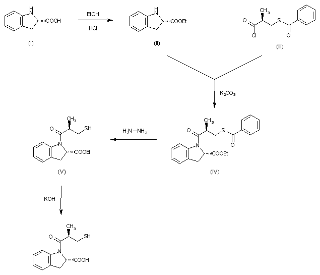 The esterification of indoline-2-carboxylic acid (I) with ethanol HCl gives the corresponding ethyl ester (II), which is acylated with 3-(benzoylthio)-2-methylpropionyl chloride (III) by means of K2CO3 in methylene chloride yielding ethyl N-[3-(benzoylthio)-2-methylpropionyl]indoline-2-carboxylate (IV). The deprotection of (IV) with hydrazine in the same solvent affords ethyl N-(3-mercapto-2-methylpropionyl)indoline-2-carboxylate (V), which is finally saponified with KOH in methanol water.