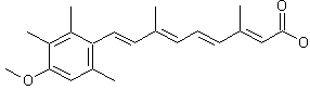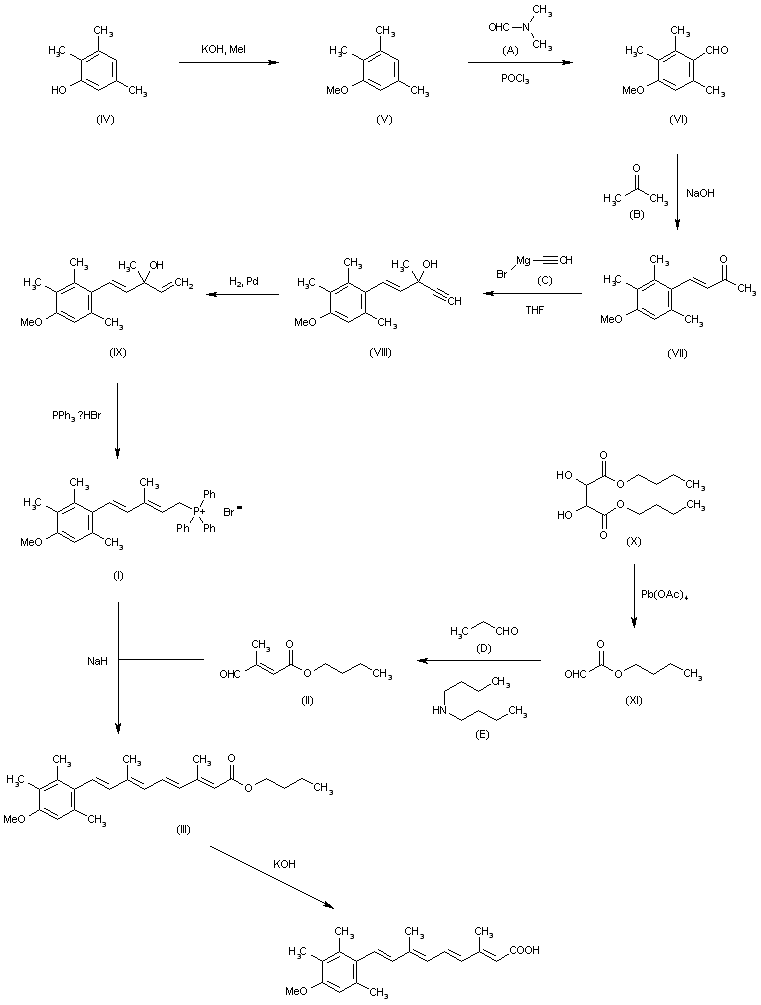 By condensation of 5-(4-methoxy-2,3,6-trimethylphenyl)-3-methylpenta-2,4-diene-1-triphenylphosphonium bromide (I) with 3-formylcrotonic acid butyl ester (II) by means of NaH in DMF to yield 9-(4-methoxy-2,3,6-trimethylphenyl)-3,7-dimethylnona-2,4,6,8-tetraen-1-oic acid butyl ester (III), which is then hydrolyzed with KOH in refluxing ethanol - water. The starting products (I) and (II) are obtained as follows: 1) The methylation of 2,3,5-trimethylphenol (IV) with KOH and methyl iodide in refluxing aqueous ethanol gives 2,3,5-trimethylanisole (V), which is then carbonylated with POCl3 and DMF (A) to afford 4-methoxy-2,3,6-trimethylbenzaldehyde (VI). The condensation of (VI) with acetone (B) by means of NaOH gives 4-(4-methoxy-2,3,6-trimethylphenyl)-3-buten-2-one (VII), which by a Grignard reaction with ethynylmagnesium bromide (C) in THF is converted into 5-(4-methoxy-2,3,6-trimethylphenyl)-3-methyl-3-hydroxy-4-penten-1-yne (VIII). The controlled hydrogenation of (VIII) with H2 over a Pd catalyst in hexane yields 5-(4-methoxy-2,3,6-trimethylphenyl)-3-methyl-3-hydroxy-1,4-pentadiene (IX), which is finally treated with triphenylphosphonium bromide in benzene at 60 C to give the phosphonium salt (I). 2) The oxidation of dibutyl L-(+)-tartrate (X) with lead tetraacetate in benzene gives butyl glyoxalate (XI), which is then condensed with propionic aldehyde (D) by means of dibutylamine (E) to afford ester (II).