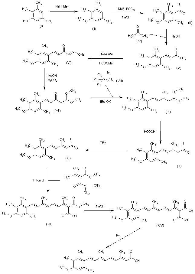 The methylation of 2,3,5-trimethylphenol (I) with NaH and Me-I in DMSO gives 1-methoxy-2,3,5-trimethylbenzene (II), which is condensed with DMF by means of POCl3 and NaOH to yield 4-methoxy-2,3,6-trimethylbenzaldehyde (III). The condensation of benzaldehyde (III) with acetone (IV) by means of NaOH affords the butenone (V). The condensation of (V) with methyl formate by means of NaOMe in ethyl ether provides the sodium enolate (VI), which is treated with MeOH and H2SO4 to obtain the dimethylacetal (VII). The condensation of (VII) with the phosphonium bromide (VIII) by means of tBu-OK in cyclohexane gives the methylene derivative (IX), which is hydrolyzed with formic acid to yield the aldehyde (X). The isomerization of (X) by means of TEA in ethyl ether affords the 5-(4-methoxy-2,3,6-trimethylphenyl)-3-methyl-2,4-pentadienal as a mixture of (E,E) and (Z,E)-isomers that is separated by chromatography. The desired (E,E)-isomer (XI) is condensed with dimethyl isopropylidenemalonate (XII) by means of Triton B in methanol and hydrolyzed with HCl to provide the monoester (XIII), which is saponified with NaOH in methanol/water to give the malonic acid derivative (XIV). Finally, this compound is monodecarboxylated by means of pyridine in dichloromethane to yield the target Acitretin (Etretin).