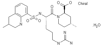 A new short synthesis of argatroban has been reported: The protection of 4-methylpiperidine (I) with (Boc)2O gives the carbamate (II), which is condensed with benzyl chloroformate by means of sec-butyl lithium and TMEDA in ethyl ether to yield (?-trans-1-(tert-butoxycarbonyl)-4-methylpiperidine-2-carboxylic acid benzyl ester (III). Deprotection of the NH group of (III) with HCl in ethyl acetate affords (?-trans-4-methylpiperidine-2-carboxylic acid benzyl ester (IV), which is condensed with the protected arginine derivative (V) by means of isobutyl chloroformate and TEA to provide the corresponding amide as a diastereomeric mixture. Resolution of this mixture by flash chromatography furnishes the desired diastereomer (VI), which is treated with HCl in ethyl acetate in order to remove the Boc-protecting group to yield compound (VII). Condensation of compound (VII) with 3-methylquinoline-8-sulfonyl chloride (VIII) by means of TEA in dichloromethane affords the expected sulfonamide (IX). Finally, this compound is submitted to hydrogenation with H2 over Pd/C in AcOH/ethanol in order to produce debenzylation, cleavage of the NO2 group and hydrogenation of the pyridine ring to yield argatroban.