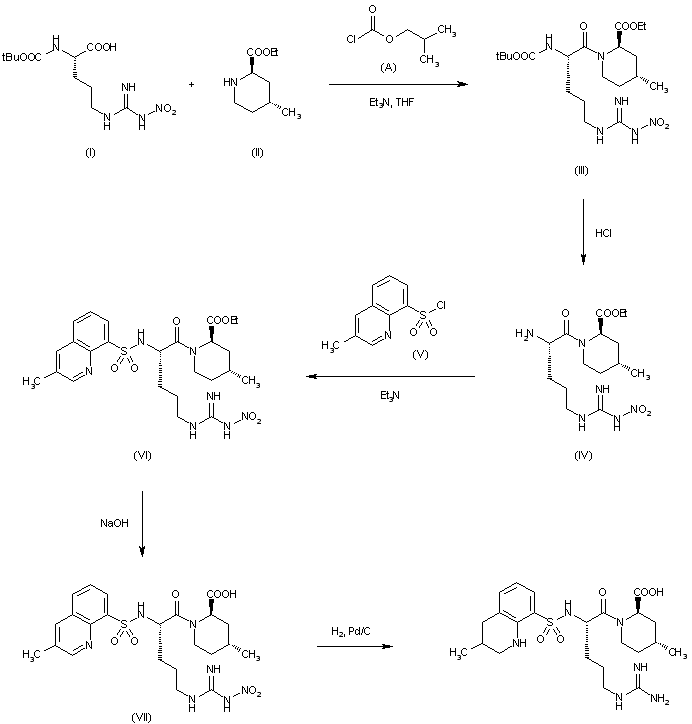 The condensation of N(G)-nitro-N2-(tert-butoxy-carbonyl)-L-arginine (I) with ethyl 4-methylpiperidine-2-carboxylate (II) by means of isobutyl chloroformate (A) and triethylamine in THF gives ethyl 1-[N(G)-nitro-N2-(tert-butoxycarbonyl)-L-arginyl]-4-methylpiperidine-2-carboxylate (III), which is protected with HCl in ethyl acetate yielding ethyl 1-(N(G)-nitro-L-arginyl)-4-methylpiperidine-2-carboxylate (IV). The condensation of (IV) with 3-methylquinoline-8-sulfonyl chloride (V) by means of triethylamine in chloroform affords ethyl 1-(N(G)-nitro-N2-(3-methyl-8-quinolinylsulfonyl)-L-arginyl]-4-methyl-2-piperidinecarboxylate (VI), which is hydrolyzed with NaOH in ethanol-water giving 1-[N(G)-nitro-N2-(3-methyl-8-quinolinylsulfonyl)-L-arginyl]-4-methyl-2-piperidinecarboxylic acid (VII). Finally, this compound is deprotected and reduced by hydrogenation with H2 over Pd/C in ethanol.