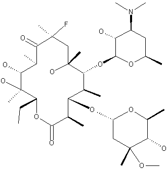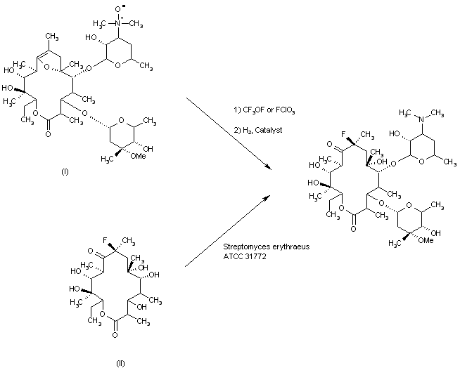 This compound can be obtained by two different ways: 1) By fluorination of 8,9-anhydroerythromycin A 6,9-hemiketal N-oxide (I) with trifluoromethyl hypofluorite (or perchloryl fluoride), followed by reduction of the corresponding N-oxide obtained. 2) By biological synthesis, starting from (8S)-8-fluoroerythronolide A (II) in a culture broth of Streptomyces erythraeus ATCC 31772, a blocked mutant of an erythromycin-producing strain.