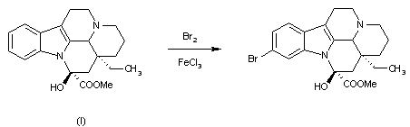 By bromination of vincamine (I) with Br2 in CHCl3 using FeCl3 as catalyst.