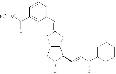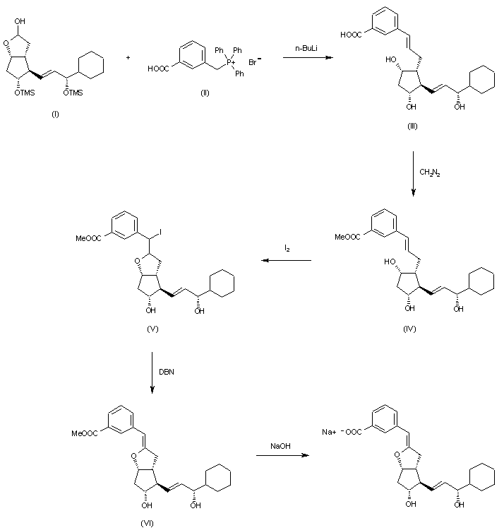 The Wittig condensation of 3alpha,5alpha-bi(trimethylsilyloxy)-2beta-(3-hydroxy-3-cyclohexyl-trans-1-propenyl)cyclopentan-1alpha-acetaldehyde-gamma-lactol (I) with m-carboxyphenylmethyl-triphenylphosphonium bromide (II) by means of butyllithium in DMSO gives 2,3,4-trinor-inter-m-phenylene-9,11,15-trihydroxy-15-cyclohexyl-16,17,18,19,20-pentanorprosta-5,13-dienoic acid (III), which is methylated with diazomethane in ether to the corresponding methyl ester (IV). The reaction of (IV) with I2 and NaHCO3 in ether - water yields the iodinated epoxide (V), which is treated with 1,5-diazabicyclo[4.3.0]non-5-ene in toluene to eliminate HI affording CG-4203 methyl ester (VI). Finally, this compound is saponified with NaOH in methanol - water.