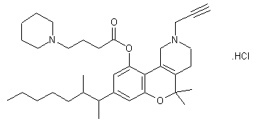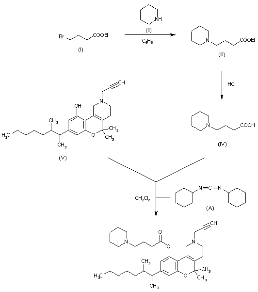 Ethyl 4-bromobutyrate (I) is condensed with piperidine (II) in refluxing benzene to give ethyl 4-(1-piperidyl)butyrate (III), which is hydrolyzed with refluxing aqueous HCl to 4-(1-piperidyl)butyric acid (IV) . Finally, this acid is esterified with 5,5-dimethyl-8-(3-methyl-2-octyl)-10-hydroxy-2-(2-propynyl)-1,2,3,4-tetrahydro-5H[1]benzopyrano[3,4-d]pyridine (V) by means of dicyclohexylcarbodiimide (A) in methylene chloride.