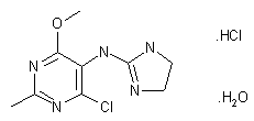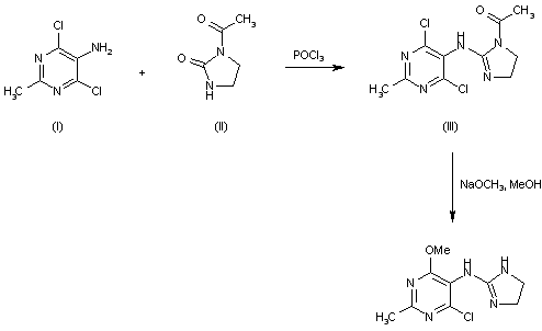 The condensation of 5-amino 2 methyl 4,6-dichloropyrimidine (I) with 1-acetyl-2-imidazolin-2-one (II) by means of POCl3 at 50 C gives 4,6-dichloro-2-methyl-5-(1-acetyl-2-imidazolin-2-ylamino)pyrimidine (III), which is then methoxylated and desacetylated by treatment with sodium methoxide in refluxing methanol.