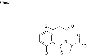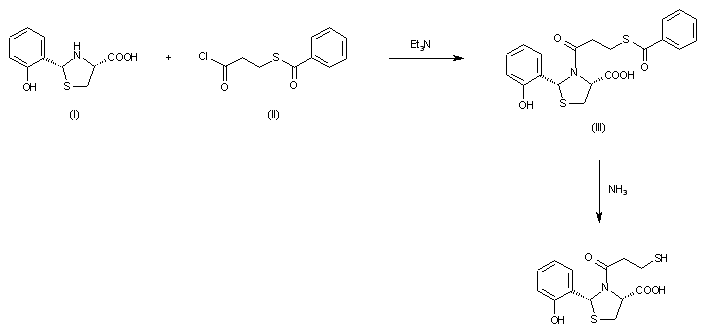 The condensation of 2-(2-hydroxyphenyl)-4-thiazolidinecarboxylic acid (I) with S-benzoyl-3-mercaptopropanoyl chloride (II) by means of triethylamine in acetone gives 3-(S-benzoyl-3-mercaptopropanoyl)-2-(2-hydroxyphenyl)-4-thiazolidinecarboxylic acid (III), which is debenzylated by a treatment with NH3.