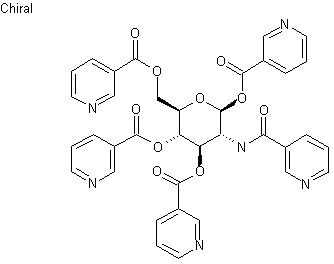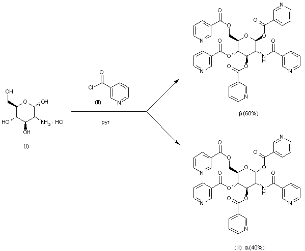 Reaction of D-(+)-glucosamine HCl, with six equivalents of 3-pyridinylcarbonyl chloride (III) in hot pyridine gives a mixture of alpha and beta-penta-substituted D-(+)-glucosamines and lower substituted D-(+)-glucosamines, from which compound (III) is isolated by crystallization.