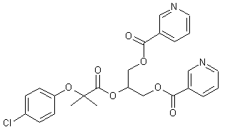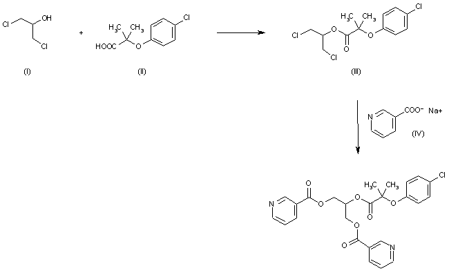 Sterification of 1,3-dichloro-2-propanol (I) with p-chlorophenoxyisobutyric acid (II) forms 1,3-dichloro-2-propanol 2-p-chlorophenoxyisobutirate (III), which, by reaction with the sodium salt of nicotinic acid, is transformed into trihydroxipropane 2-p-chlorophenoxyisobutyrate-1,3-dinicotinate.