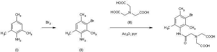 The bromination of 2,4,6-trimethylaniline (I) with Br2 in aqueous HCl gives 3-bromo-2,4,6-trimethyl-aniline (II), which is then condensed with nitrilotriacetic acid (III) by means of pyridine and acetic anhydride.