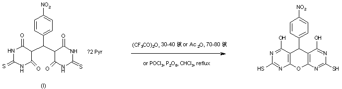 The title pyranodipyrimidine derivative is prepared by cyclization of 4-nitrobenzylidene bis-thiobarbituric acid pyridine salt (I) employing either trifluoroacetic anhydride at 30-40 C or in lower yields with acetic anhydride at 70-80 C. The cyclization of is also carried out in the presence of POCl3/P2O5 in refluxing chloroform.