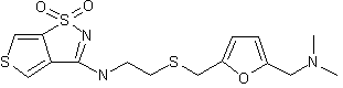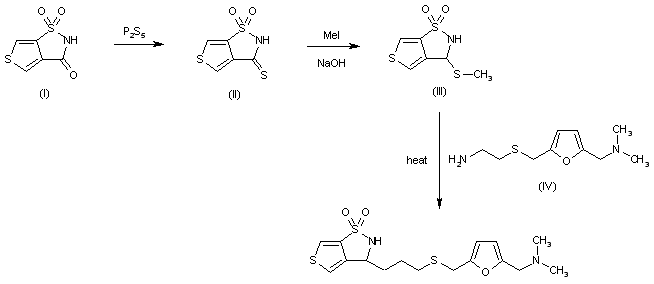 The reaction of thieno[3,4-d]isothiazole-3(2H)-one-1,1-dioxide (I) with P2S5 in hot pyridine gives the corresponding thione (II), which by treatment with methyl iodide and NaOH to refluxing ethanol - water is converted to 3-(methylthio)thieno[3,4-d] isothiazole-1,1-dioxide (III). Finally, this compound is condensed with 2-[5-(dimethylaminomethyl)-2-furanylmethylthio]ethylamine (IV) to refluxing ethanol.