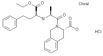 The condensation of alanine tert-butyl ester (I) with ethyl 2-bromo-4-phenylbutanoate (II) by means of triethylamine in hot DMF gives ethyl 2-[[1-(tert-butoxycarbonyl)ethyl]amino]-4-phenylbutanoate (III), which is partially hydrolyzed with trifluoroacetic acid yielding ethyl 2-[[1-carboxyethyl]amino]-4-phenylbutanoate (IV). The condensation of (IV) with benzyl 1,2,3,4-tetrahydroisoquinoline-3-carboxylate (V) [prepared from the corresponding acid (VI) and benzyl alcohol (A) by means of polyphosphoric acid] by means of triethylamine and 1-hydroxybenzotriazole affords benzyl 2-[2-[[1-(ethoxycarbonyl)-3-phenylpropyl]amino]-1-oxopropyl]-1,2,3,4-tetrahydroisoquinoline-3-carboxylate (VII), which is finally debenzylated by hydrogenolysis with H2 over Pd/C in THF.