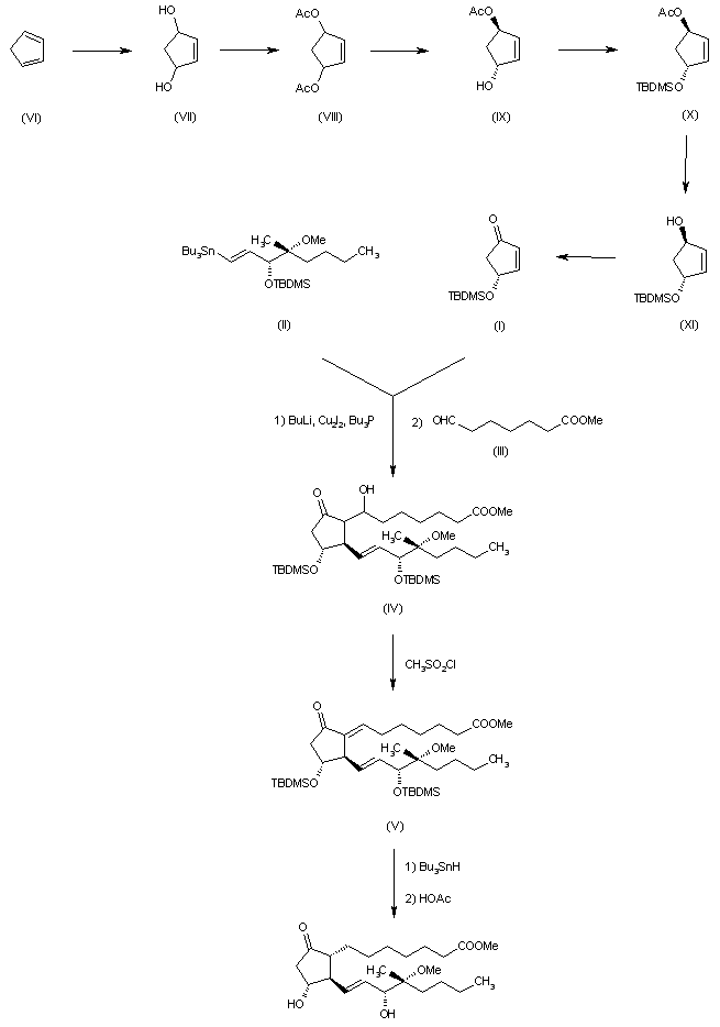 The reaction of 3(R)-(tert-butyldimethylsilyloxy)-4(R)-methoxy-4(R)-methyl-1-(tributylstannyl)-1(E)-octene (II) with butyllithium, cuprous iodide and tributylphosphine gives an intermediate copper derivative which is condensed first with 4(R)-(tert-butyldimethylsilyloxy)-2-cyclopentenone (I) and then with methyl 6-formylhexanoate (III) to give the 7-hydroxy PGE1 derivative (IV). The dehydration of (IV) with mesyl chloride yields the unsaturated PGE compound (V), which is reduced with tributystannyl hydride and finally deprotected with acetic acid in THF. The starting products (I) and (II) are obtained as follows: 1) The oxidation of cyclopentadiene (VI) gives 2-cyclopentene-1,4-diol (VII), which is acetylated to the diacetate (VIII). Selective hydrolysis of (VIII) yields (1S, 4R)-4-hydroxy-2-cyclopentenyl acetate (IX), which is protected with tert-butyldimethylsilyl chloride to the protected acetate (X). Partial hydrolysis of (X) affords the semiprotected alcohol (XI), which is finally oxidized to the cyclopentenone (I).