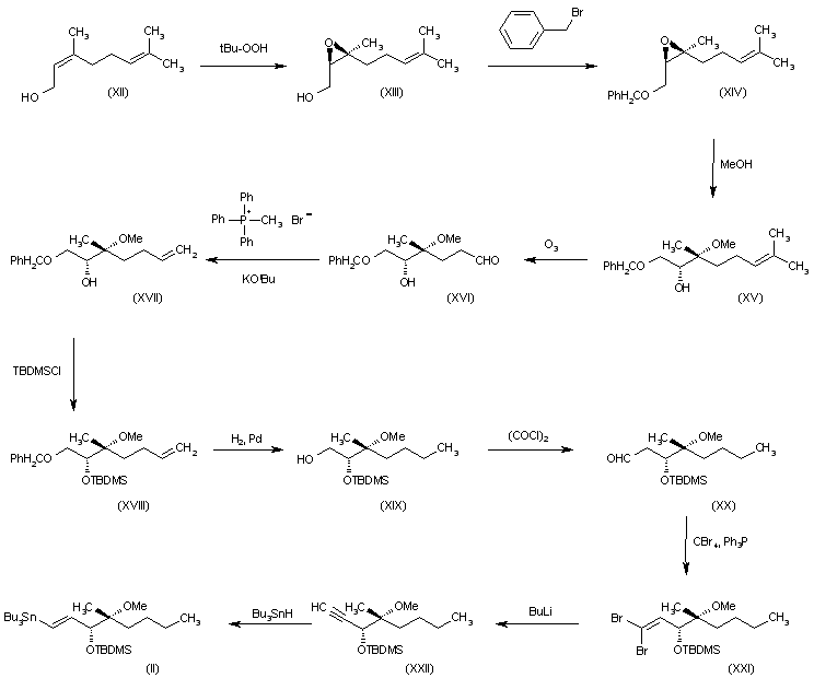 2) The epoxidation of nerol (XII) with tert-butyl peroxide and titanium isopropoxide gives the epoxide (XIII), which is benzylated with benzyl bromide to the protected epoxide (XIV). A stereo- and regioselective cleavage of the epoxide (XIV) with methanol yields the methoxy hydroxy derivative (XV), which is ozonolyzed in methanol dichloromethane to the aldehyde (XVI). The Wittig condensation of (XVI) with triphenylmethylphosphonium bromide and potassium tert-butoxide affords the methylene alcohol (XVII), which is protected with tert-butyldimethylsilyl chloride as before to give silyl derivative (XVIII). The hydrogenation of (XVIII) with H2 over Pd in ethyl acetate yields the saturated alcohol (XIX), which is oxidized with oxalyl chloride in DMSO to the aldehyde (XX).The reaction of (XX) with tetrabromomethane and triphenylphosphine affords the dibromovinyl compound (XXI), which by reaction with butyllithium in THF is converted into the acetylene (XXII). Finally, this compound is treated with tributylstannyl hydride and azobisisobutyronitrile to give the stannyl derivative (II).