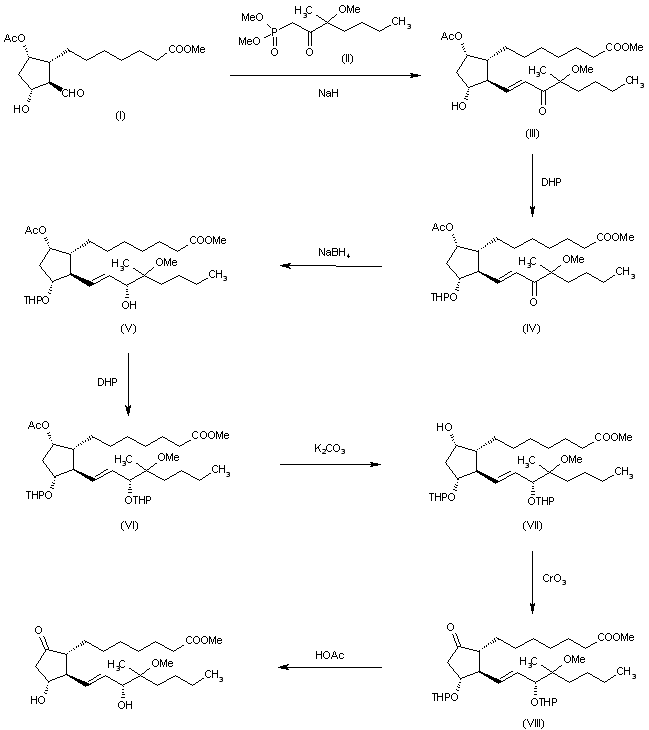 The Wittig condensation of methyl 7-(5alpha-acetoxy-2beta-formyl-3alpha-hydroxycyclopent-1-yl)heptanoate (I) with dimethyl 3-mothoxy-3-methyl-2-oxoheptyl phosphonate (II) by means of NaH in dimethoxy ethane gives methyl 9alpha-acetoxy-11alpha-hydroxy-16-methoxy-16-methyl-15-oxoprosta-13-en-1-oate (III), which is treated with dihydropyran and p-toluenesulfonic acid to yield the 11alpha-tetrahydropyranyloxy derivative (IV). The reduction of (IV) with NaBH4 in methanol affords methyl 9alpha-acetoxy-15-hydroxy-16-methoxy-16-methyl-11alpha-(tetrahydropyranyloxy)prosta-13-en-1-oate (IV), which is protected again with dihydropyran as before to give the 11,15-bis(tetrahydropyranyloxy) derivative (VI). The hydrolysis of the acetoxy group of (VI) with K2CO3 in methanol affords methyl 9alpha-hydroxy-16-methoxy-16-methyl-11alpha,15-bis(tetrahydropyranyloxy)prosta-13-en-1-oate (VII), which is oxidized with Collins' reagent (CrO3-pyridine) in methylene chloride yielding methyl 16-methoxy-16-methyl-9-oxo-11alpha,15-bis(tetrahydropyranyloxy)prosta-13-en-1-oate (VIII). Finally, this compound is deprotected by a treatment with acetic acid in THF - water.