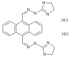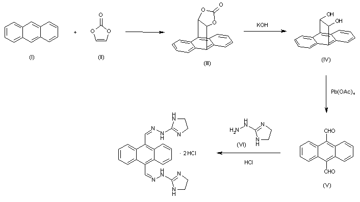 The reaction of anthracene (I) with refluxing vinylene carbonate (II) gives 9,10-dihydro-9,10-ethanoanthracene-11,12-diol cyclic carbonate (III), which is hydrolyzed with KOH in hot ethanol water affording 9,10-dihydro-9,10-ethanoanthracene-11,12-diol (IV). The oxidation of (IV) with lead tetraacetate in acetic acid yields 9,10-anthracenedicarboxaldehyde (V), which is finally condensed with 2-hydrazino-2-imidazoline (VI) by means of HCl in refluxing ethanol.