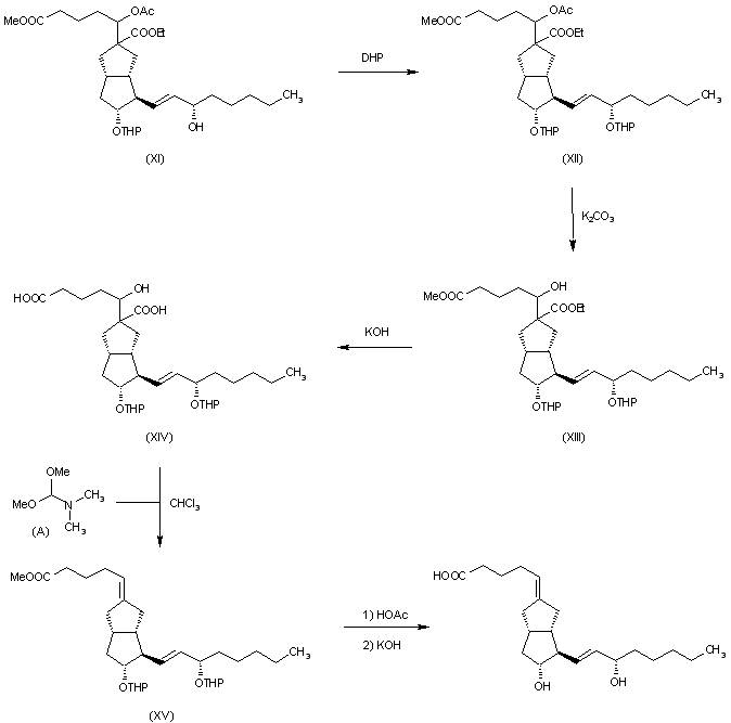 The protection of (XI) with dihydropyran as usual affords the bistetrahydropyranylether (XII), which is deacetylated with K2CO3 in methanol to the 5-hydroxyester (XIII). Total hydrolysis of (XIII) with aqueous KOH gives the diacid (XIV), which is submitted to a dehydrative decarboxylation with N,N-dimethylformamide dimethyl acetal (A) in CHCl3 yielding the protected carbacyclin (XV). Finally, this compound is deprotected with aqueous acetic acid and hydrolyzed with KOH.