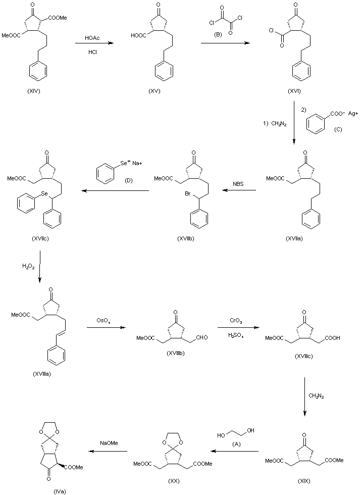 The decarboxylative hydrolysis of 2,4-dimethoxycarbonyl-3-(3-phenylpropyl)cyclopentanone (XIV) with HCl in acetic acid gives 4-carboxy-3-(3-phenylpropyl)cyclopentanone (XV), which by reaction with oxalyl chloride (B) is converted into the corresponding acyl chloride (XVI). The Arndt-Eistert carbon homologation in (XVI) with diazomethane and silver benzoate (C) in methanol affords 4-(methoxycarbonylmethyl)-4-(3-phenylpropyl)cyclopentanone (XVIIa), which is dehydrogenated by the sequence of reactions: N-bromosuccinimide and sodium selenofenolate (D) [to obtain intermediates (XVIIb) and (XVIIc), respectively], followed by reaction with hydrogen peroxide to give 4-(methoxycarbonylmethyl)-3-(3-phenylallyl)cyclopentanone (XVIIIa). Oxidation of (XVIIIa) first with osmium tetroxide and then with Jones reagent (CrO3) [to obtain intermediates (XVIIIb) and (XVIIIc), respectively], followed by methylation of (XVIIIc) with CH2N2 affords 3,4-di(methoxycarbonylmethyl)cyclopentanone (XIX), which is ketalized in the usual way to the ketal (XX). Finally, this compound is submitted to a Dieckmann condensation with sodium methoxide in DMS to yield the protected ketoester (IVa), the methyl ester analogue of the compound (IV) obtained in scheme 09083302a. This compound can then be used instead of (IV) in scheme 09083302a.