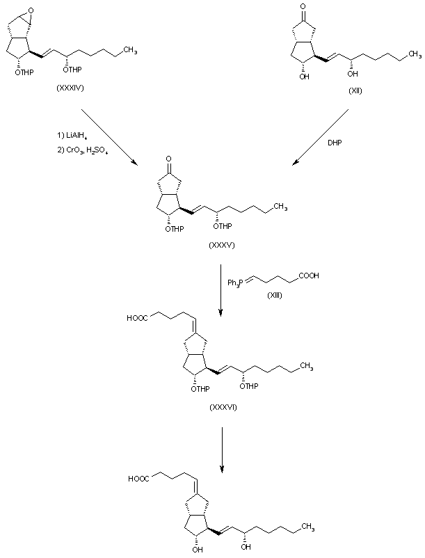 Reduction of (XXXIV) with LiAlH4, followed by oxidation with Collins reagent affords the bis(tetrahydropyranyl)ketone (XXXV) (which can also be obtained by reaction of dihydroxyketone (XII) with dihydropyran). The Wittig reaction of (XXXV) with phosphorane (XIII) gives the protected carbacyclin (XXXVI), which is finally deprotected in the usual way.