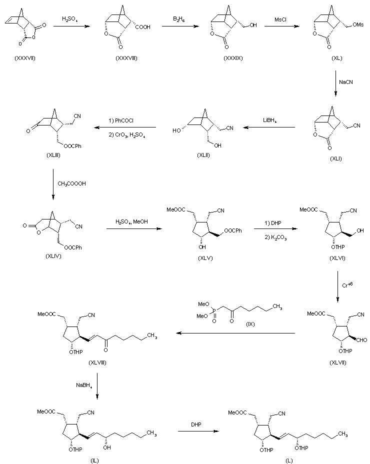 The reaction of 5-norbornen-2,3-dicarboxylic anhydride (XXXVII) with hot H2SO4 gives the lactone (XXXVIII), which is reduced with diborane in THF yielding the hydroxylactone (XXXIX). The mesylation of (XXXIX) as usual gives the ester (XL), which by reaction with NaCN in DMSO is converted into the cyanolactone (XLI). The reduction of the lactone ring with LiBH4 in diglyme affords the dihydroxynitrile (XLII), which by benzoylation and oxidation with Jones reagent yields the benzoylated cyanoketone (XLIII). The oxidation of (XLIII) with peracetic acid gives the benzoylated cyanolactone (XLIV), which by methanolysis with H2SO4 and methanol is converted into the cyanoester (XLV). The protection of the free alcohol of (XLV) with dihydropyran and debenzoylation of the resulting product affords the hydroxymethyl cyanoester (XLVI), which by oxidation with pyridinium chlorochromate is converted into the aldehyde (XLVII). The Wittig reaction of (XLVII) with the phosphonate (IX) yields the ketonic cyanoester (XLVIII), which is reduced with NaBH4 to the corresponding alcohol (XLIX). The reaction of (II) with dihydropyran affords the corresponding bis(tetrahydropyranyl) derivative (L).