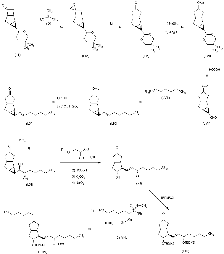 The reaction of 7-oxotricyclo[4.2.0.0(2.4)]octane-3-endo-carboxaldehyde neopentylglycol acetal (LIII) with dimethylsulfonium methylide (G) gives the spiroepoxide (LIV), which by isomerization with LiI in THF yields the tricyclononanone (LV). The reduction of (LV) with NaBH4 in ethanol, followed by acetylation with acetic anhydride in pyridine affords the tricyclic acetate (LVI), which is treated with formic acid to eliminate the acetalic residue and form the free aldehyde (LVII). The Wittig reaction of (LVII) with triphenylhexylidenephosphorane (LVIII) affords the tricyclic acetate (LIX), which is hydrolyzed with base and oxidized with Jones reagent to yield the tricyclic ketone (LX). The oxidation of the double bond of (LX) with 0sO4 gives the diol (LXI), which submitted successively to: triethyl orthopropionate (H) in pyridine, to anhydrous formic acid, to aqueous methanolic K2CO3 and to sodium metaperiodate, is converted into the previously obtained dihydroxyketone (XII). This compound can be used in the preceding syntheses or protected with dimethyltert-butylsilyl chloride to afford the bis(silyl) ether (LXII), which by reaction with the sulfoximine (LXIII), and then with AlHg is converted into the protected trialcohol (LXIV).