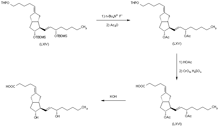 Selective hydrolysis of the silyl groups of (LXIV), and acetylation with acetic anhydride yields the diacetate (LXV), which is hydrolyzed again selectively with acetic acid, and oxidized with Jones reagent to afford the carbacyclin diacetate (LXVI) Finally, this compound is hydrolyzed with base.