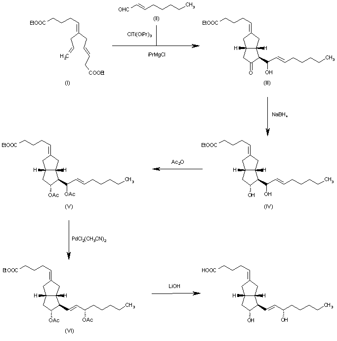 The cyclization of undecadienedioic acid diethyl ester (I) with 2(E)-octenal (II) by means of ClTi(OiPr)3 gives the pentalenone derivative (III), which is reduced with NaBH4 in methanol, yielding alcohol (IV) after chromatographic purification. The acylation of (IV) with Ac2O and pyridine affords the diacetate (V), which is rearranged with a catalytic amount of PdCl2(CH3CN)2 in THF to provide the diacetate (VI). Finally, this compound is hydrolyzed with LiOH in methanol.