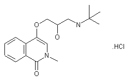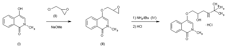The condensation of N-methyl-4-hydroxyisocarbostyril (I) with epichlorohydrin (II) by means of sodium methoxide in hot methanol gives 4-(2,3-epoxypropoxy)-N-methylisocarbostyril (III), which is then treated with tert-butylamine (IV) in methanol, and with HCl.