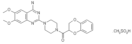 The acylation of piperazine (I) with 1,4-benzodioxan-2-ylcarbonyl chloride (II) by means of sodium acetate in water-acetone gives N-(1,4-benzodioxan-2-carbonyl)piperazine (III), which is then condensed with 4-amino-2-chloro-6,7-dimethoxyquinazoline (IV) in refluxing butanol.