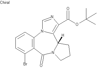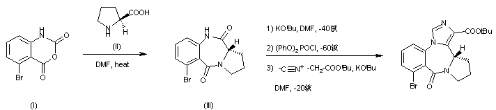 5-Bromo-2H-3,1-benzoxazine-2,4(1H)-dione (I) and L-proline (II) are heated in DMF to form (S)-6-bromo-1,2,3,11a-tetrahydro-5H-pyrrolo[2,1-c][1,4]benzodiazepine-5,11(10H)-dione (III). This lactam is then reacted with t-BuOK and diphenyl chlorophosphate, and subsequently with the anion of tert-butyl isocyanoacetate.