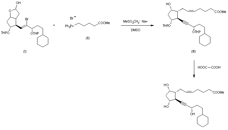 The Wittig condensation of the bicyclic lactol (I) with 4-(methoxycarbonyl)butyl triphenylphosphonium bromide (II) by means of sodium methylsulfinyl carbanide in DMSO and simultaneous dehydrobromination gives the bis(tetrahydropyranyl) derivative (III), which is finally deprotected by a treatment with oxalic acid in refluxing acetone.