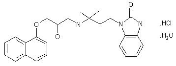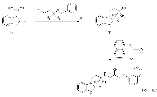 The reaction of 1-(1-propen-2-yl)-2 benzimidazolinone (I) in hexamethylphosphorus triamide with sodium hydride and 3-benzalamino-3,3-dimethylpropyl chloride (II) and treating the reaction product with hydrochloric acid gives 1-(3 amino-3,3-dimethylpropyl)-2 benzimidazolone (III). The amine (III) is refluxed with 1-(1-naphthyloxy)propylene-(2,3)-oxide (IV) yielding the title compound.