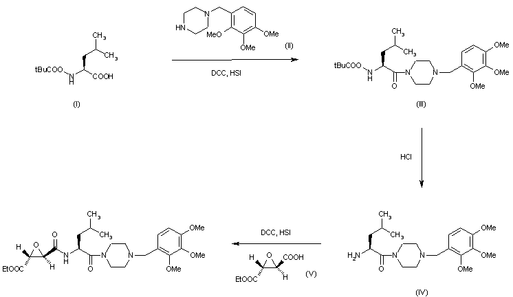 The condensation of N-(tert-butoxycarbonyl)-L-leucine (I) with 1-2,3,4-trimethoxybenzyl)piperazine (II) by means of N-hydroxysuccinimide (HSI) and dicyclohexylcarbodiimide (DCC) in dichloromethane gives the corresponding acylated piperazine (III), which is deprotected with dry HCl in ethyl acetate yielding the leucine derivative (IV). Finally, this compound is condensed with trans-epoxysuccinic acid monoethyl ester (V) by means of DCC and HSI as before and treated with H2SO4.