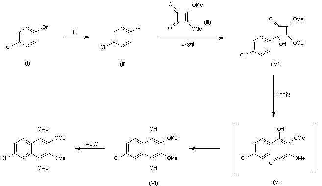 The metalation of 4-chlorobromobenzene (I) with lithium gives 4-chlorophenyllithium (II), which is condensed with dimethyl squarate (III) in THF at -78 C giving 4-(4-chlorophenyl)-4-hydroxy-2,3-dimethoxy-2-cyclobuten-1-one (IV). The isomerization of (IV) in refluxing xylene (38 C) affords naphthohydroquinone (VI) through the intermediate ketene (V). Finally, compound (VI) is acetylated with acetic anhydride in pyridine - dimethylaminopyridine.