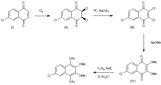 The chlorination of 6-choro-1,4-naphthoquinone (I) with Cl2 in acetic acid gives 2,3,6-trichloro-2,3-dihydro-1,4-naphthoquinone (II), which is treated with sodium acetate and Cl2 in refluxing acetic acid yielding 2,3,6-trichloro-1,4-naphthoquinone (II) The reaction of (III) with sodium methoxide in reftuxing methanol affords 6-chloro-2,3-dimethoxy-1-4-naphthoquinone (IV), which is finally reduced with H2 over Pd/C IP THF, and acetylated with acetic anhydride in pyridine (I).