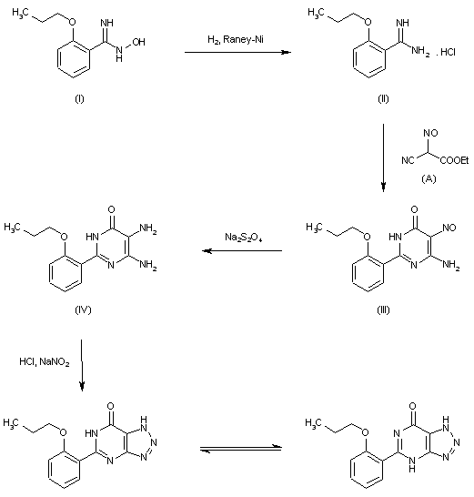 By reduction of 2-propoxybenzamidoxime (I) with H2 over Raney-Ni in ethanol to give 2-propoxybenzamidine (II), m.p. 170-1 C, which was condensed with ethyl alpha-nitrosocyanacetate (A) by means of sodium methoxide in methanol yielding 4-amino-2-(2-propoxyphenyl)-5-nitrosopyrimid-6-one (III), m.p. 215-6 C. This compound was reduced with sodium dithionite in water to give 4,5-diamino-2-(2-propoxyphenyl)- pyrimid-6-one (IV), m.p. 162-4 C, which was finally cyclized with sodium nitrite in aqueous HCl.