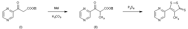 The methylation of ethyl 3-pyrazinyl-3-oxopropionate (I) with methyl iodide and K2CO3 in acetone gives ethyl 2-methyl-3-pyrazinyl-3-oxopropionate (II), which is then treated with P2S5 in refluxing toluene.