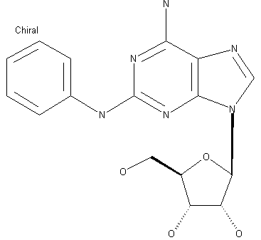 The reaction of guanosine-2',3',5'-triacetate (I) with amyl nitrite and bromoform at 90 C gives 2-bromoinosine-2',3',5'-triacetate (II), which is condensed with aniline (III) in refluxing methanol to afford N-phenylguanosine-2',3',5'-triacetate (IV). The reaction of (IV) with POCl3 and N,N-dimethylaniline in refluxing acetonitrile gives 6-chloro-N-phenyl-9-(2,3,5-tri-O-acetyl-beta-D-ribofuranosyl)-9H-purine-2-amine (V), which is finally treated with ammonia in methanol to give CV-1808.