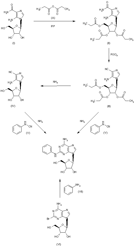 This compound can be obtained in two different ways: 1) The acylation of 5-amino-1-beta-D-ribofuranosylimidazole-4-carboxamide (I) with propionic anhydride (A) in pyridine gives the corresponding tri-O-propionyl derivative (II), which by treatment with POCl3 and triethylamine in CHCl3 is converted into 5-amino-4-cyano-1-(2,3,5-tri-O-propionyl-beta-D-ribofuranosyl)imidazole (III). The hydrolysis of (III) with methanolic ammonia yields 5-amino-4-cyano-1-beta-D-ribofuranosylimidazole (IV), which is finally cyclized with phenylcyanamide (V) in methanolic ammonia at 180 C in a pressure vessel. This cyclization can also be performed with (III) and (V) directly, using the same procedure. 2) By reaction of 2-bromoadenosine (VI) with aniline (VII) in 2-methoxyethanol at 120 C.