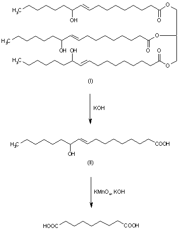The hydrolysis of glycerol ricinoleate (castor oil) (I) with KOH in refluxing 95% ethanol gives ricinoleic acid (II), which is oxidized with KMnO4 in water with KOH.